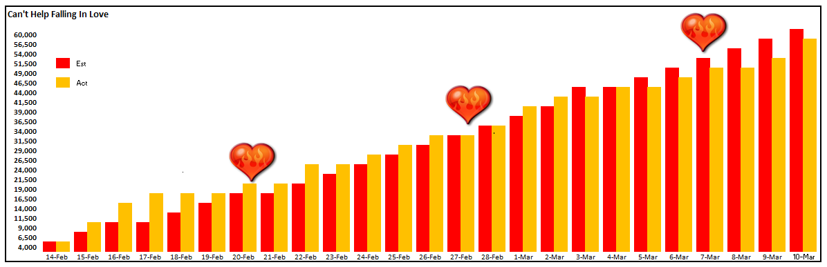I wasn’t sure I was going to make it, but I set March 10 as the deadline to finish the first draft of Can’t Help Falling in Love. The day job blew up right on schedule, but I kept pushing and today I typed “The End” at about 58,000 words. I’m short but it’s the first draft.