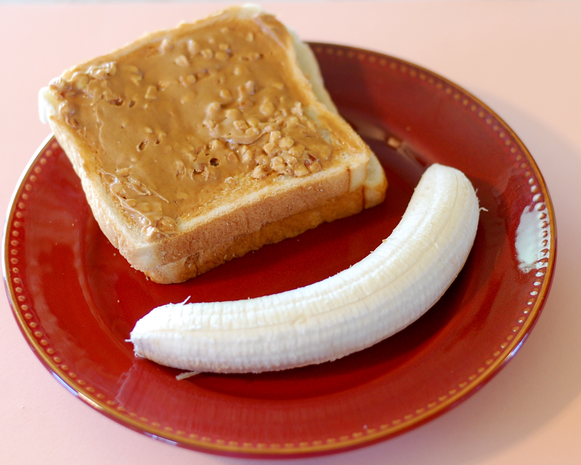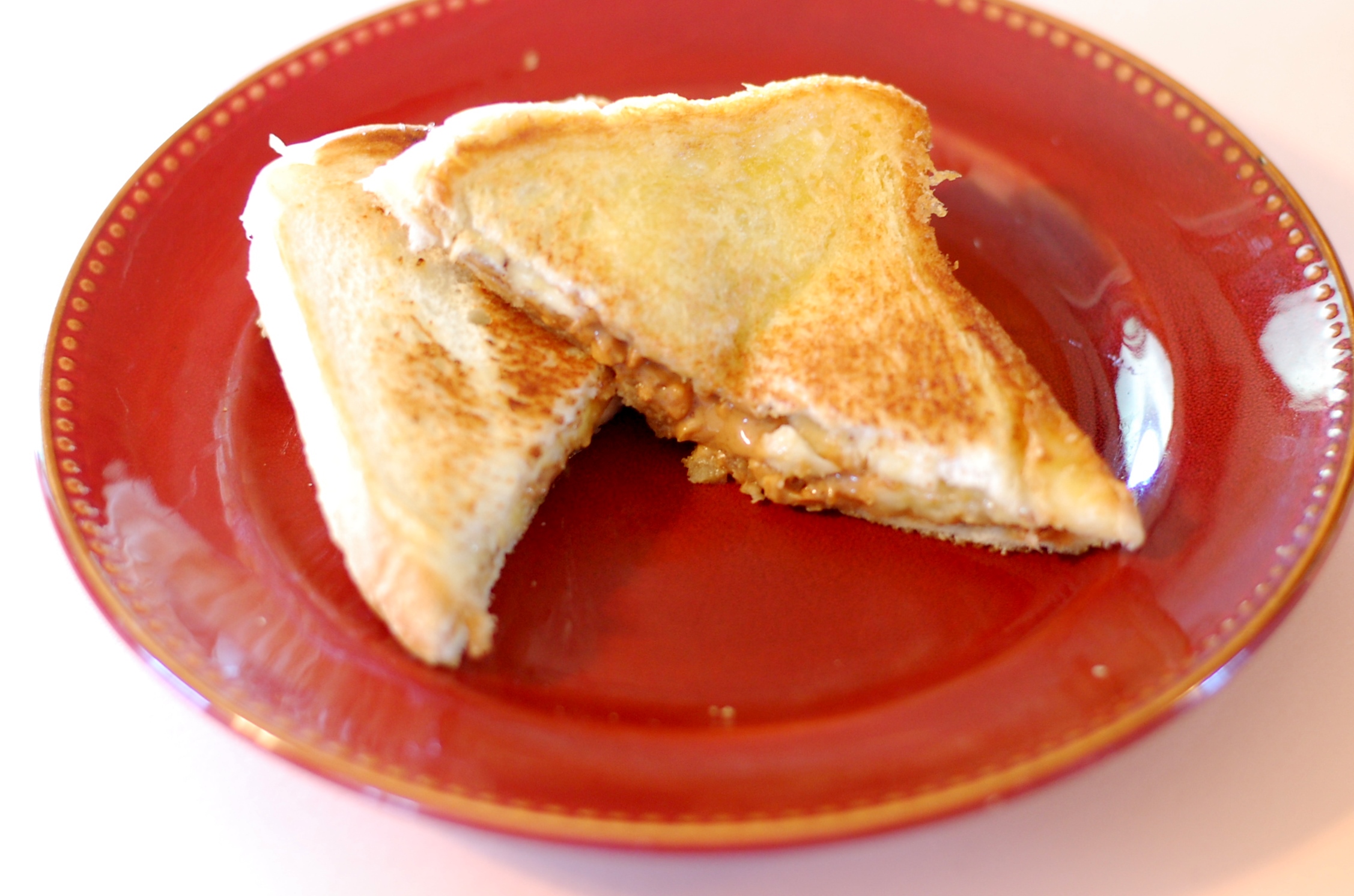 In the interests of Elvis accuracy and just plain ol’ curiosity, I decided to make an Elvis sandwich. Everybody knows this: peanut butter and banana, fried. If you decide to Google recipes, you’ll find a pretty good collection. White bread, peanut butter, banana…that we agree on. Sometimes we add honey. Sometimes we add bacon. And sometimes we add everything all at once. Nigella’s recommends mashing the bananas (not a bad idea). This one suggests Gladys Presley actually fried the bananas in bacon grease for the sandwich (but also adds blackberry and I canNOT get on board with that).