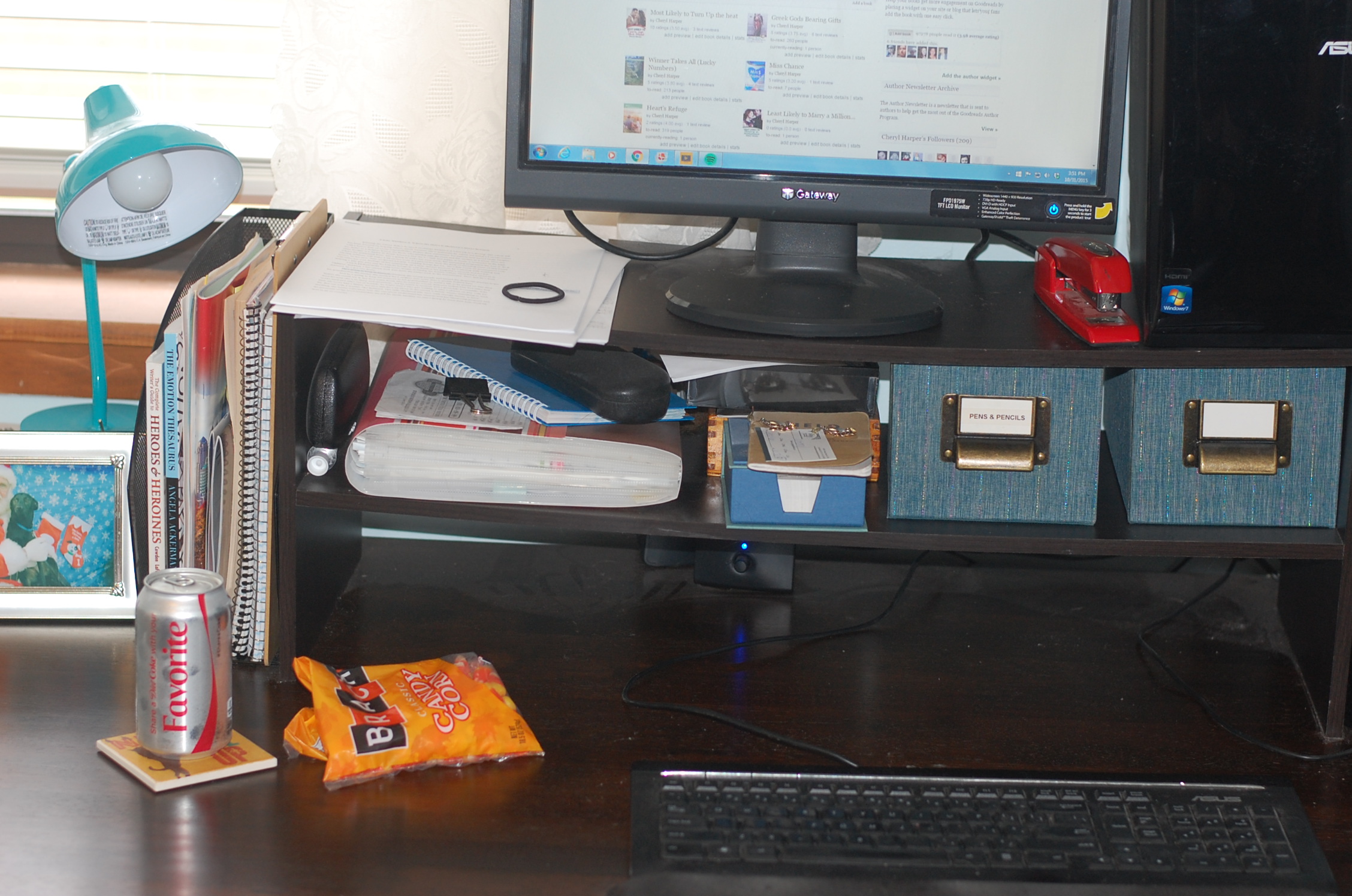 This is the Before picture of my desk. It’s been cleared of empty Diet Coke cans, dusted, and straightened. The papers are the golden synopsis and editor notes. That candy corn WAS the only candy in the house. It is gone now.