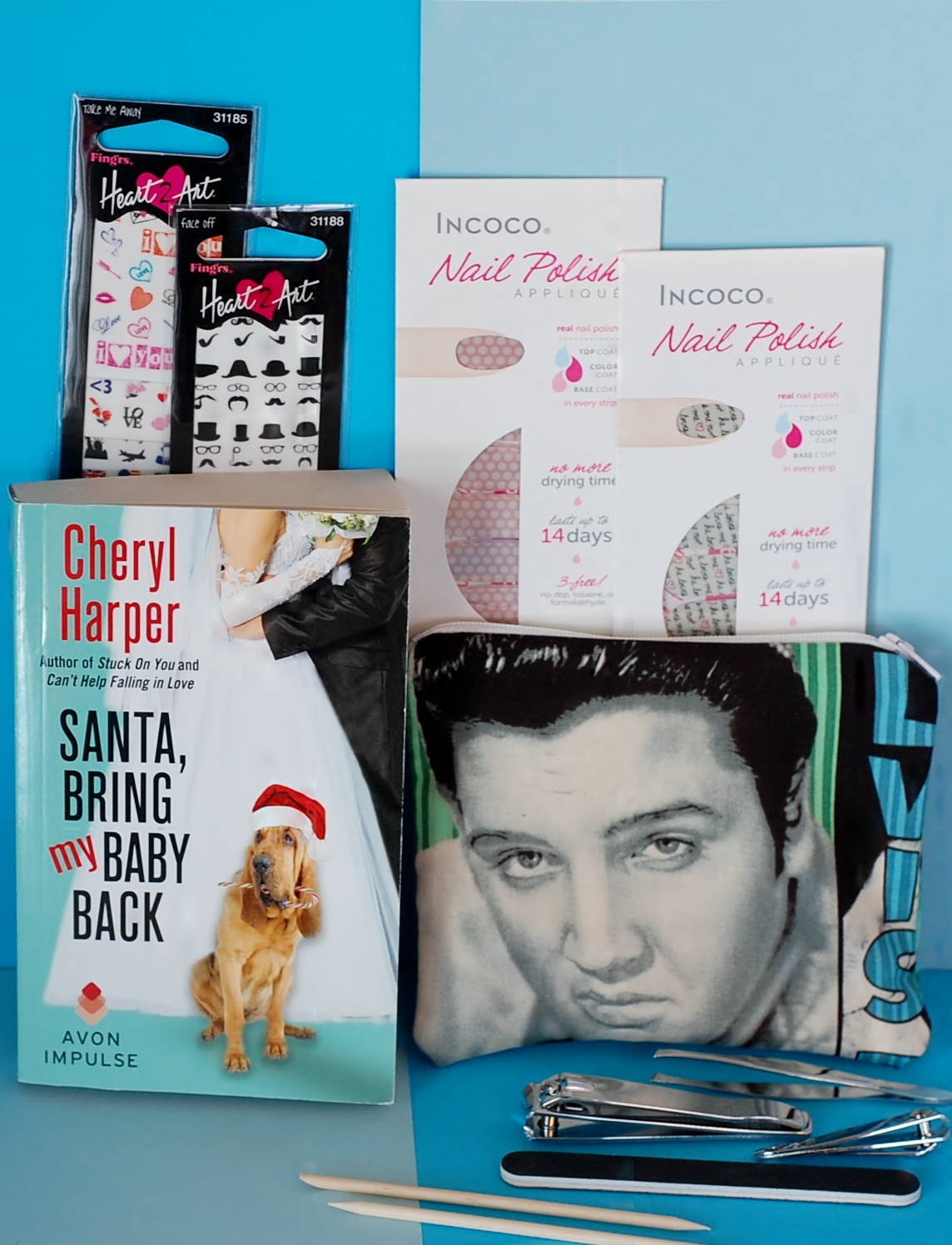 Signed copy of Santa, Bring My Baby Back, Elvis bag, Manicure set, 3 bottles of nail polish, Nail decals, Two sets of Incoco nail strips (Pink Polka Dots Sweetie Pie and First Crush)